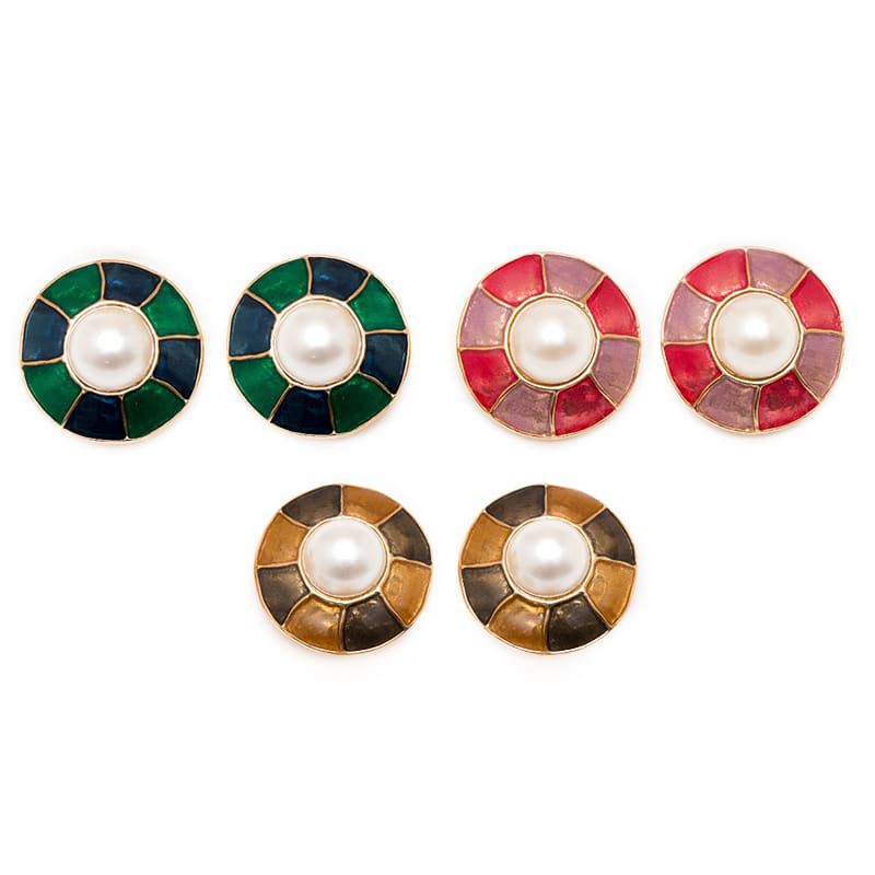 Brinco de Pressão Nice, feito em metal, com banho dourado e esmaltação em tons de verde e pérola, da designer Rosana Bernardes.