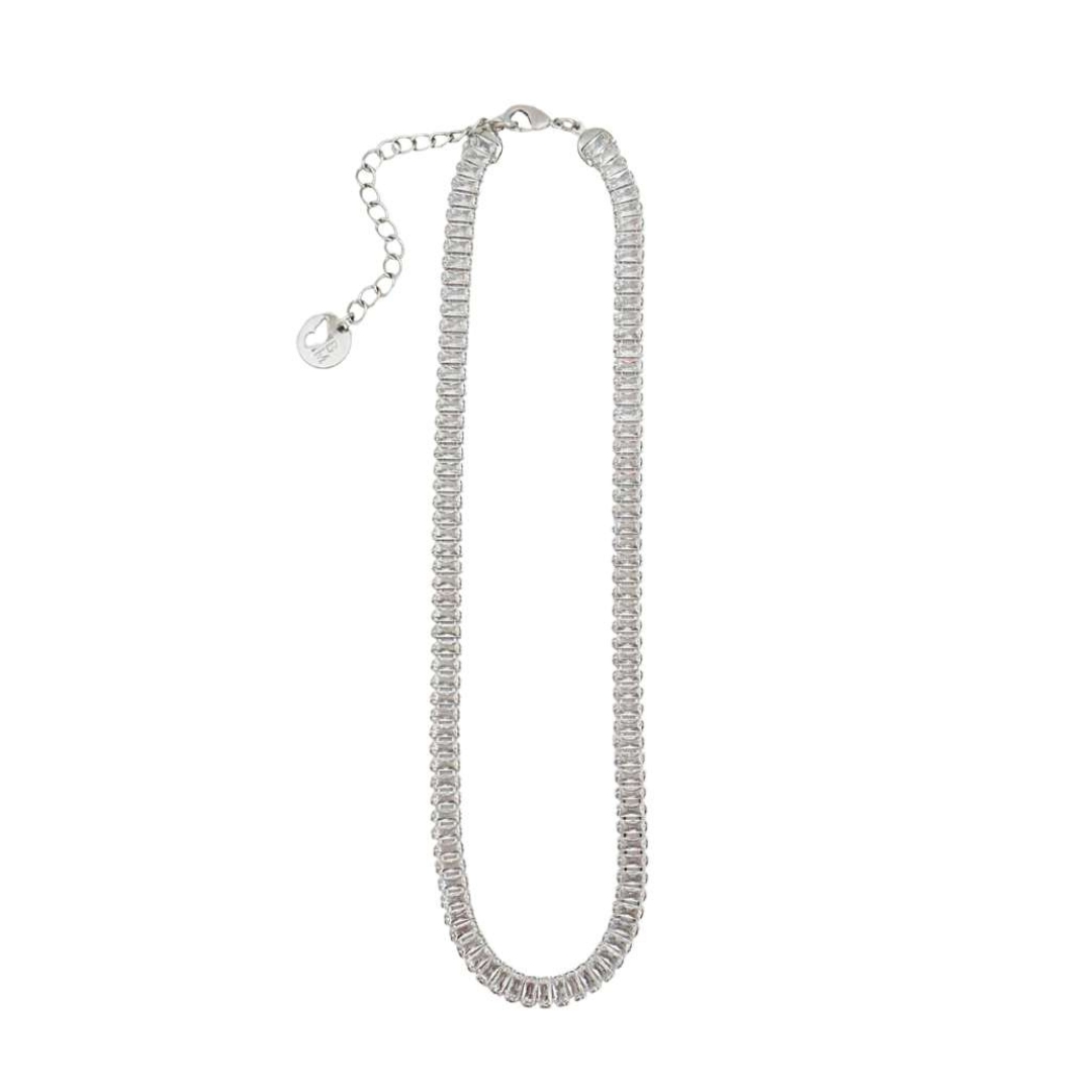 Colar de metal no banho prateado com aplicação de pedras baguete.