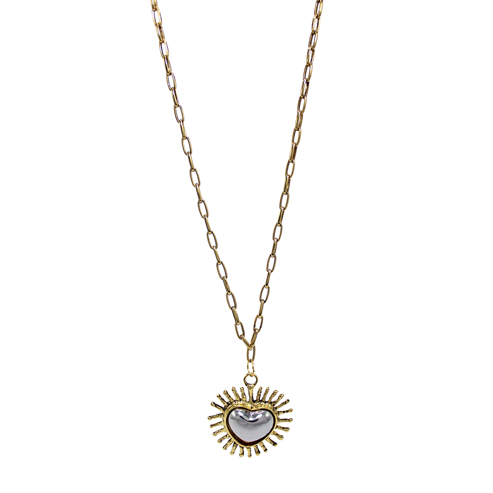 Colar longo com corrente de elos dourados e pingente de coração emoldurado por raios. Uma peça versátil que pode ser usada sozinha como protagonista do look ou em mix de colares para um visual moderno e cheio de personalidade.