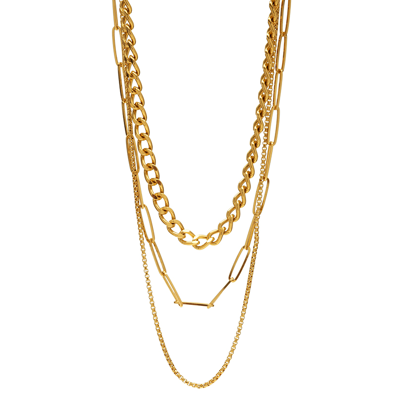 Colar de metal no banho dourado, com três correntes de elos diferentes.