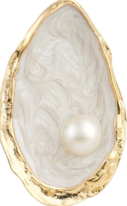 Dimensões: Ostra de metal com banho dourado, com 3,8cm na vertical e 2,4cm na horizontal, pérola sintética de 0,8cm de diâmetro em uma capa de botão de metal com 1,8cm de diâmetro e 0,4cm de altura