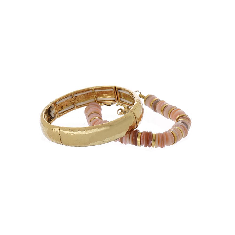 Kit de pulseiras, sendo 1 em metal no banho ouro vintage ajustável por silicone, e a outra com contas de água doce de 9mm em tons de coral com entremeios de metal no mesmo banho esta possui extensor e o fecho é mosquetão.